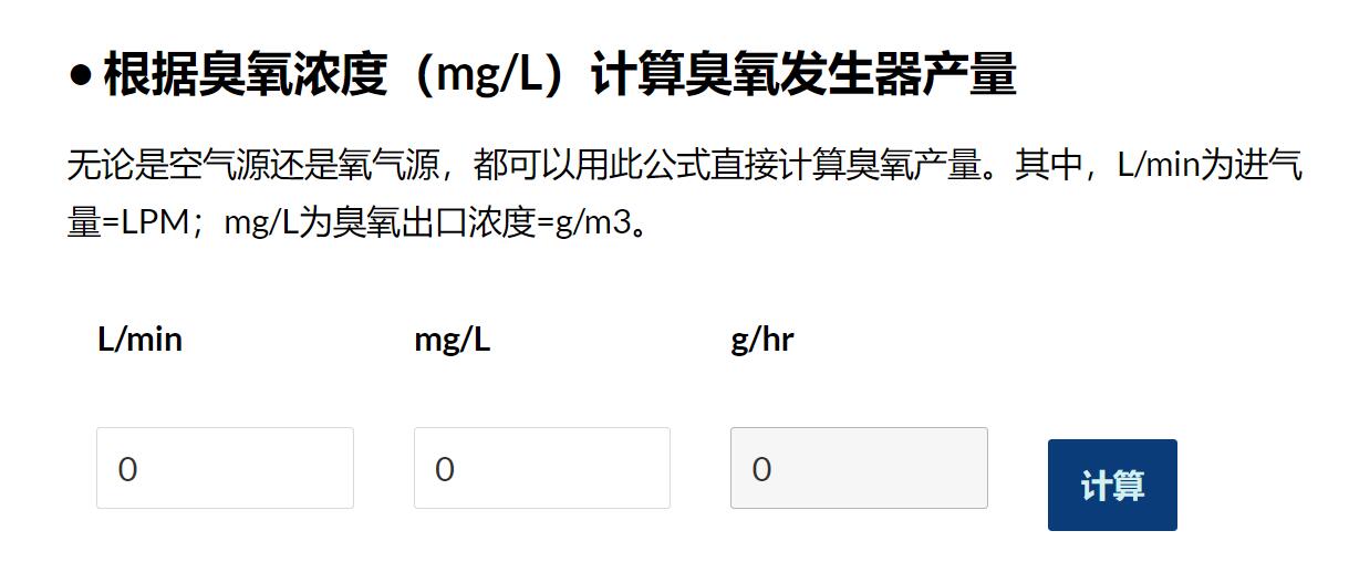 下面是同林開發(fā)的一款在線計(jì)算工具,輸入氣量和濃度,直接可以得出臭氧產(chǎn)量。